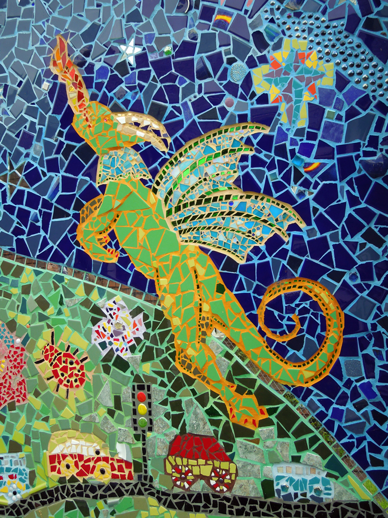 “My priority has been to work on projects that empower community members, experienced and inexperienced mosaickers, to create beauty and have a positive impact on the neighborhood,” said Shalom. “We try to involve everyone in the community, and ask people who are passing by to adhere some tiles, so that they will have a sense of pride in the work and the park and want to take care of it.”