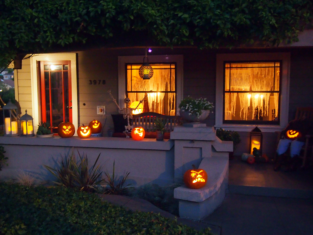 On Halloween, we like to set a spoooooky scene for our neighbors without making the wee little trick-or-treaters run off screaming in terror. Jack-o-lanterns are always a big hit, and the more the better. It takes some work ripping out their guts and carving them, but it’s totally worth it once they are all lit up and putting on a glow-fest. We use real candles that last all night, which also makes for that fabulous only-on-Halloween warm pumpkin-breath scent in the air.