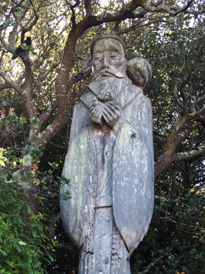 Detail of the sculpture shows a squirrel in the Saint’s hands and a bird on his shoulder. There’s even a crow looking on.