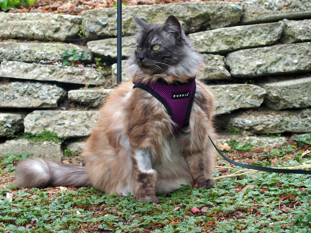In her book, the California Wildlife Habitat Garden, Nancy Bauer describes how a homeowner designed a cat run made of redwood planks and wire that connects cat doors in the house to an aerial system of caged walkways through the treetops. Nice-but I’m a designer and this garden is also our habitat. We prefer to keep the beautiful setting we have created. We considered a catio: an enclosed outdoor space where we could trap the cat while we opened the doors and windows. Again, aesthetics trumped comfort. Finally, we came up with the idea of outfitting Theo with a harness and leash.